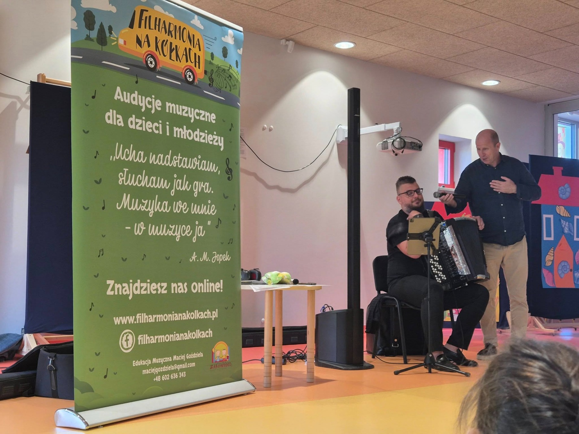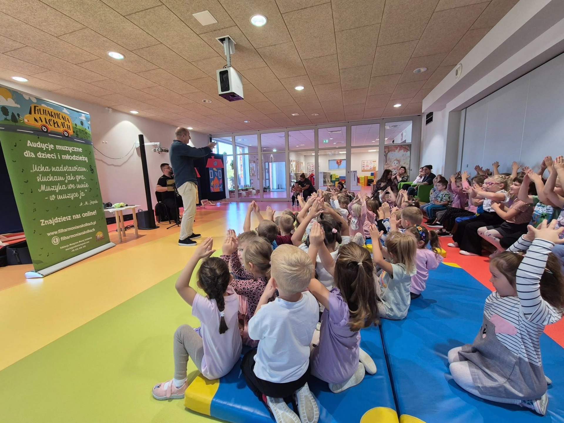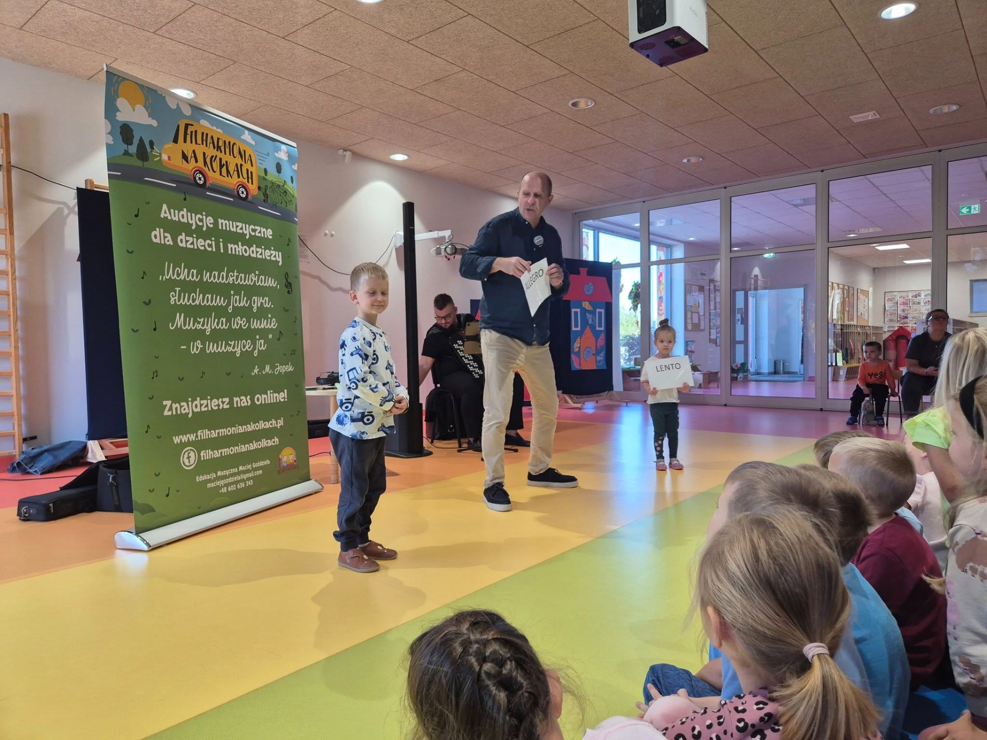 26 .09.2025r. odbył się pierwszy w tym roku koncert muzyczny firmy Filharmonia na Kółkach. Dzieci poznały pojęcia " głośno" i " cicho" oznaczające rożny stopień natężenia dźwięku , od bardzo cichych ( pianissimo , piano) do bardzo głosnych ( forte, fortissimo) . Te pojęcia występują nie tylko w muzyce ale także mogą być elementami zabaw edukacyjnych , gdzie porównuje się głośność przedmiotów lub ćwiczy kontrastowanie dynamiki dźwięków . Podczas tego spotkania przedszkolaki poznały także gamę dźwięków .