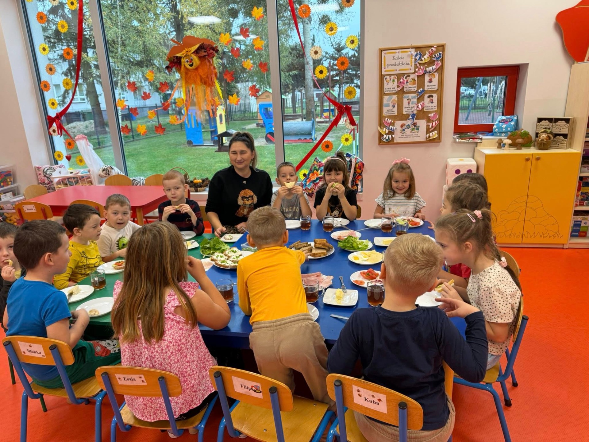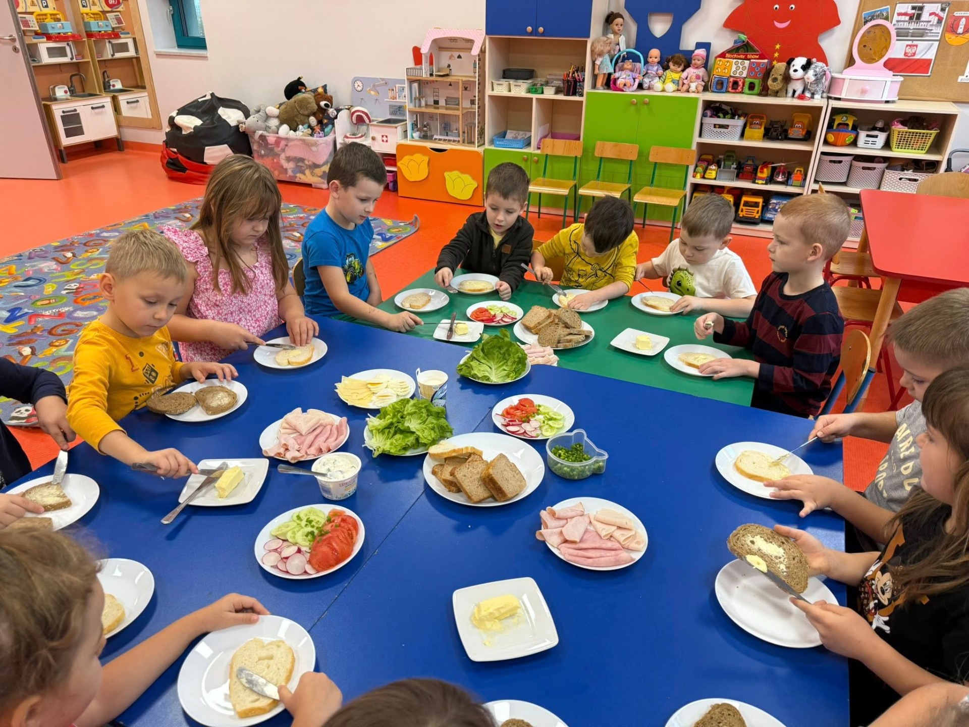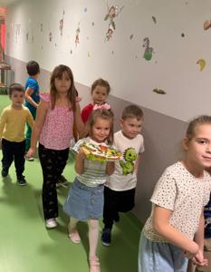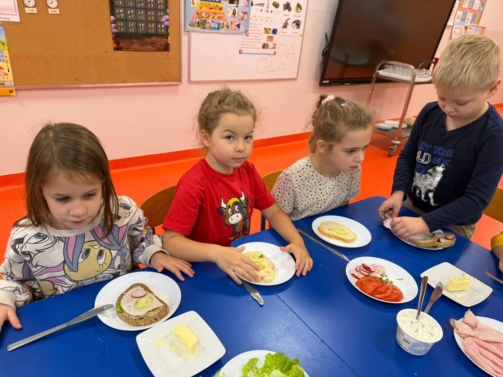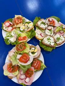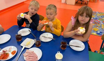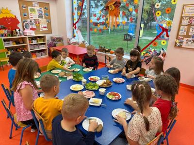 Podczas zajęć rozmawialiśmy o zasadach zdrowego odżywiania się . Dzieci dowiedziały się, jak ważne jest spożywanie regularnych posiłków. Wspólnie i samodzielnie przygotowały zdrowe śniadanie, które z dumą zaserwowały również pracownikom przedszkola.