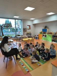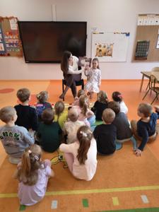 . Dzieci wysłuchały z wielkim zaciekawieniem opowiadania pt. " W głowie się nie mieści". W książce w prosty sposób przedstawione były Radość, Strach, Gniew, Odraza i Smutek jako emocje, które kierowały zachowaniem dziewczynki , bohaterki opowiadania. Drugie opowiadanie było o psie i lisku. Pies Tod i lisek Miedziak mieli super przygodę, ale najważniejsza była ich PRZYJAŹŃ .