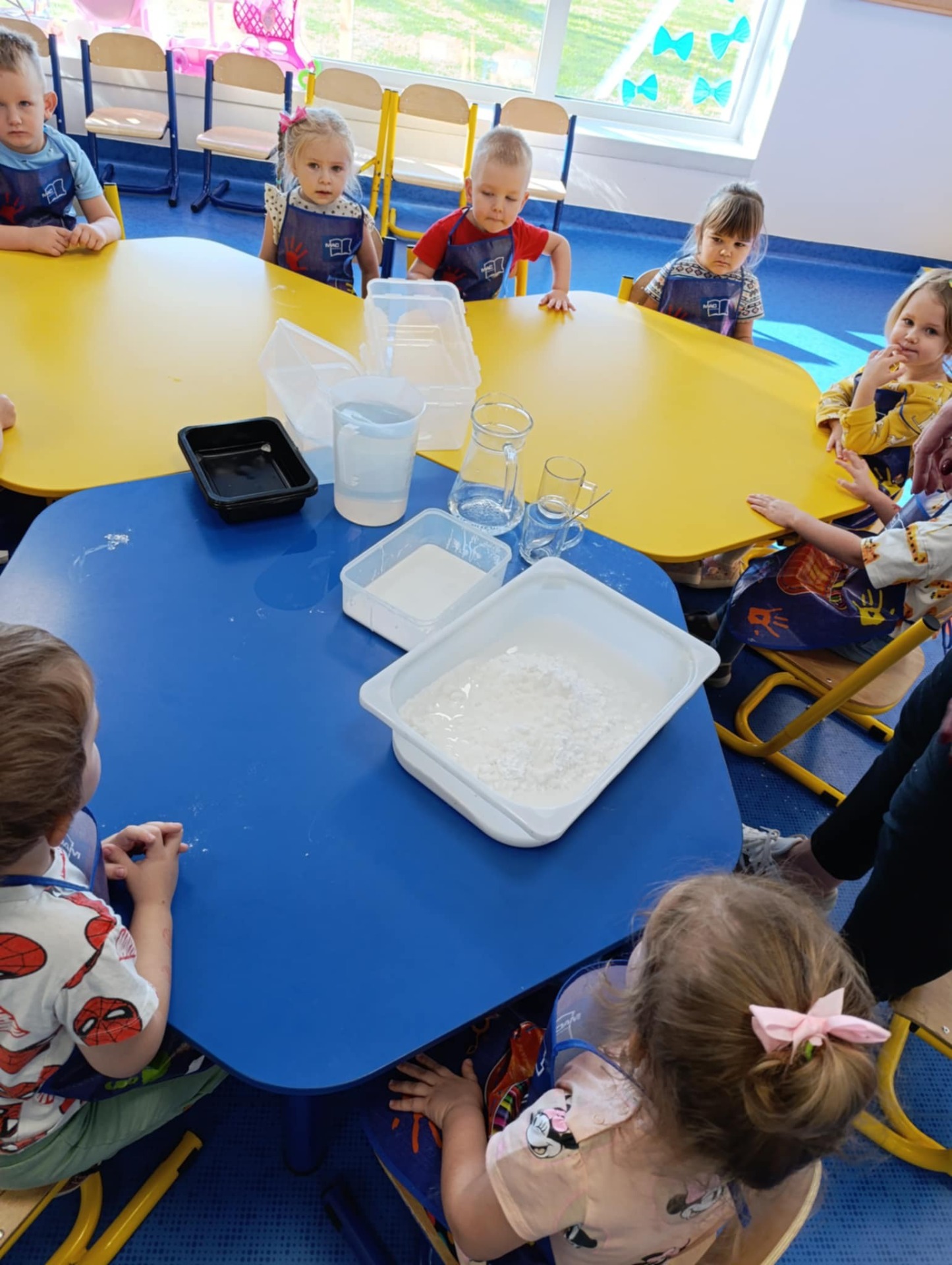 Maluchy z zaangażowaniem mieszały mąkę ziemniaczaną z wodą, sprawdzając, jak ta niezwykła masa potrafi być raz twarda, a za chwilę rozpływać się w dłoniach. To była pierwsza prosta lekcja fizyki w praktyce a także idealna okazja do rozwijania małej motoryki, kreatywności oraz ciekawości świata.