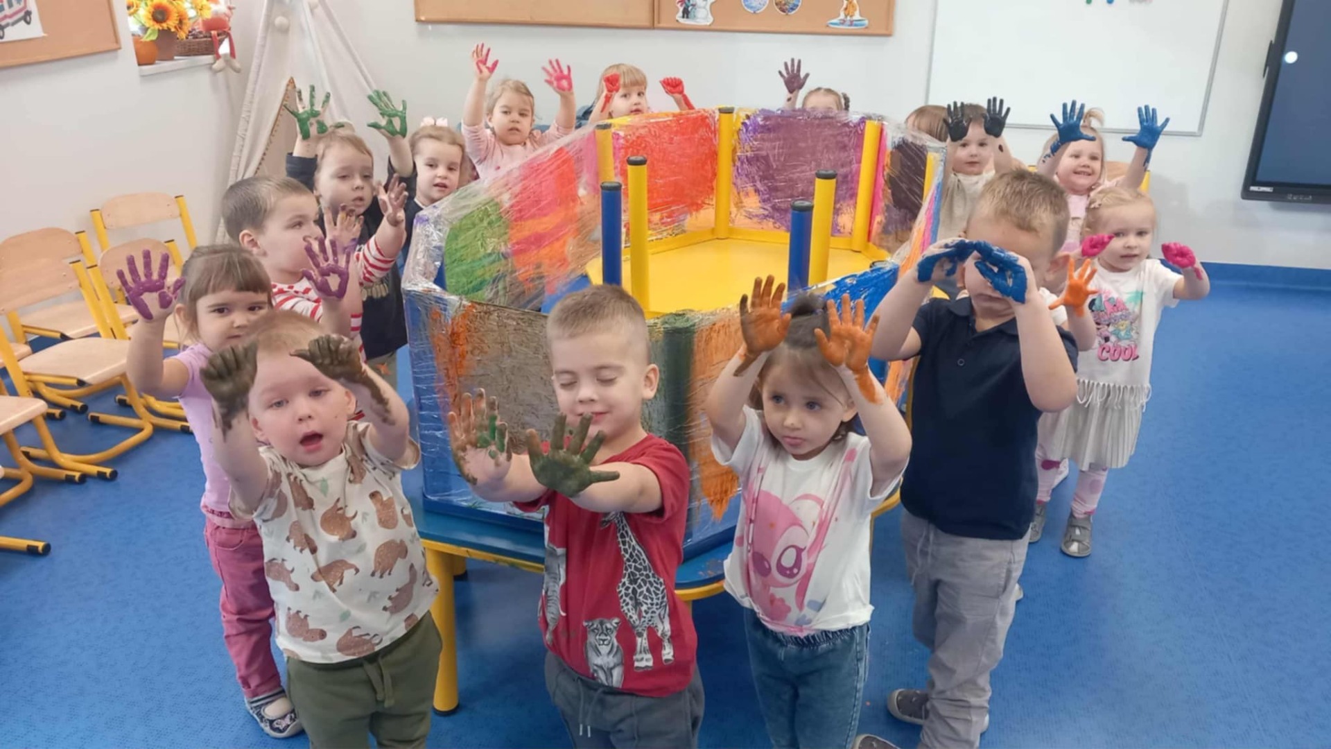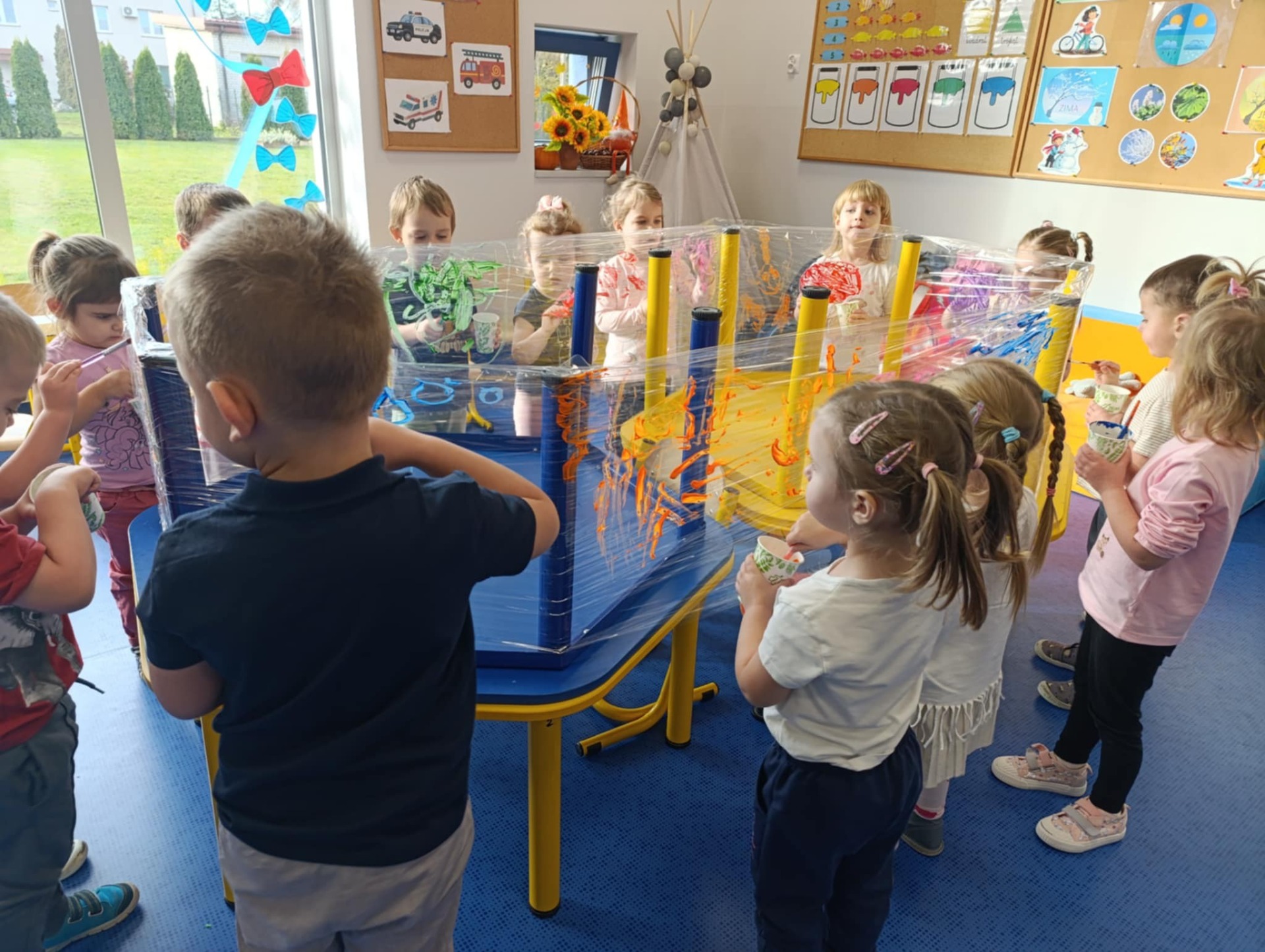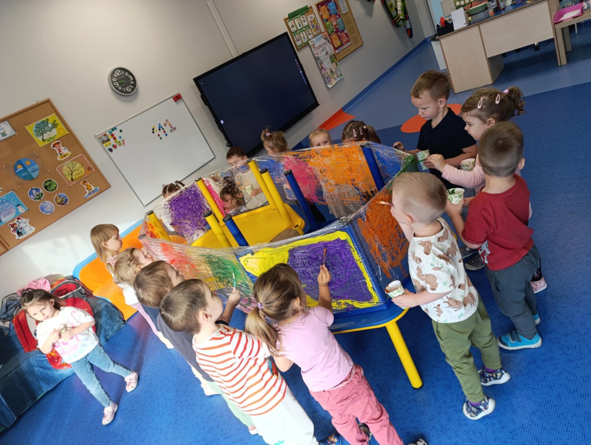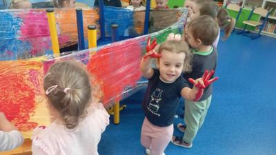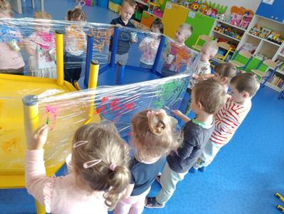 Malowanie na przezroczystej folii stretch to nie tylko unikalny efekt wizualny, ale przede wszystkim wspaniale ćwiczenie sensoryczne. Elastyczna, gładka powierzchnia i intensywne kolory farb angażują zmysły i pozwalają ns swobodną, twórczą ekspresję.
