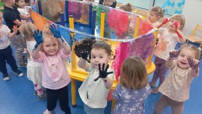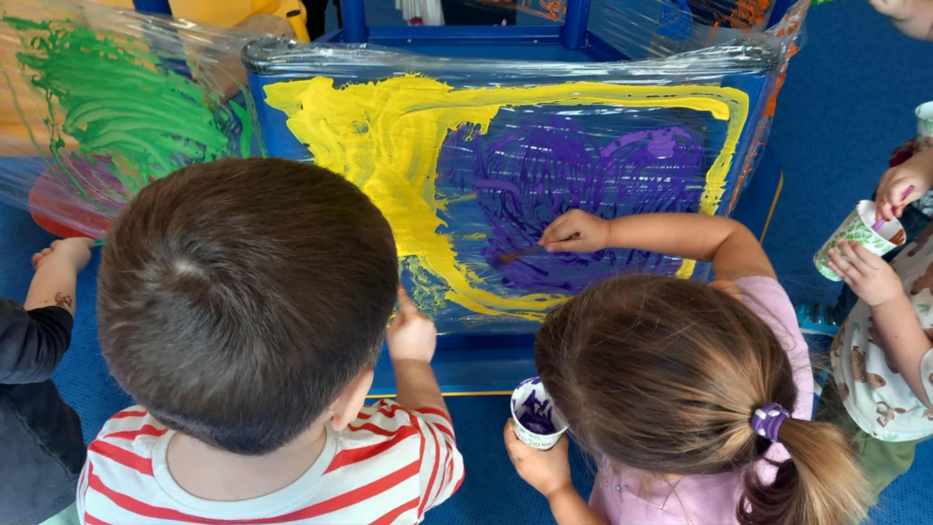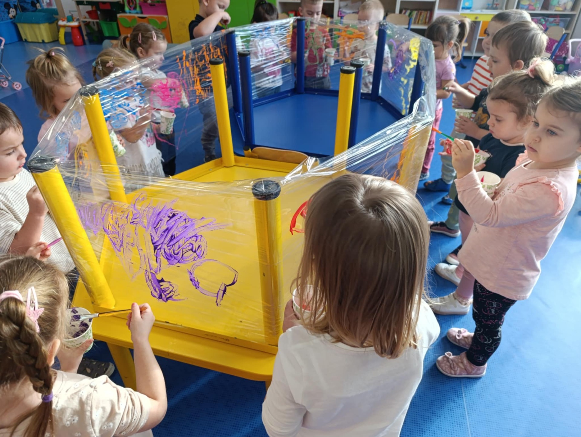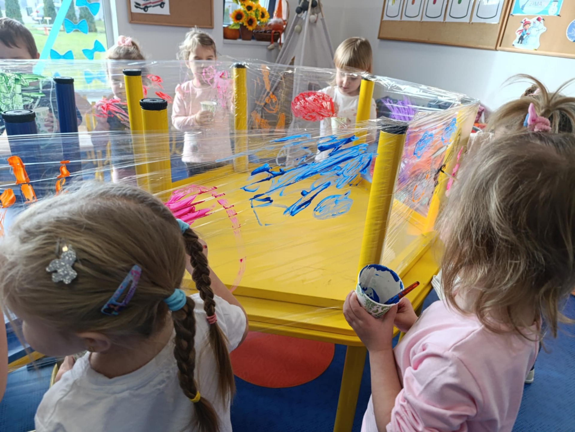 Malowanie na przezroczystej folii stretch to nie tylko unikalny efekt wizualny, ale przede wszystkim wspaniale ćwiczenie sensoryczne. Elastyczna, gładka powierzchnia i intensywne kolory farb angażują zmysły i pozwalają ns swobodną, twórczą ekspresję.
