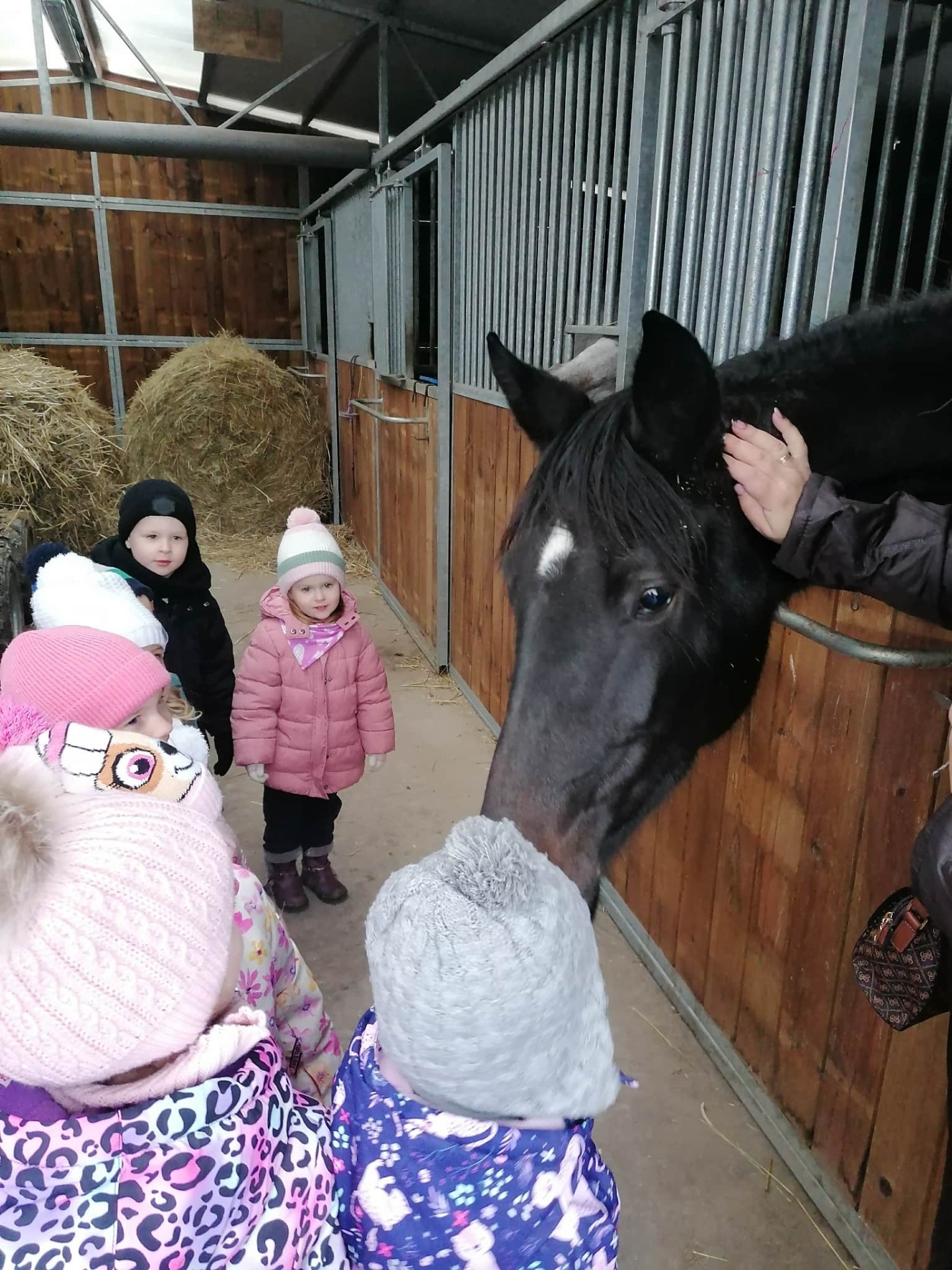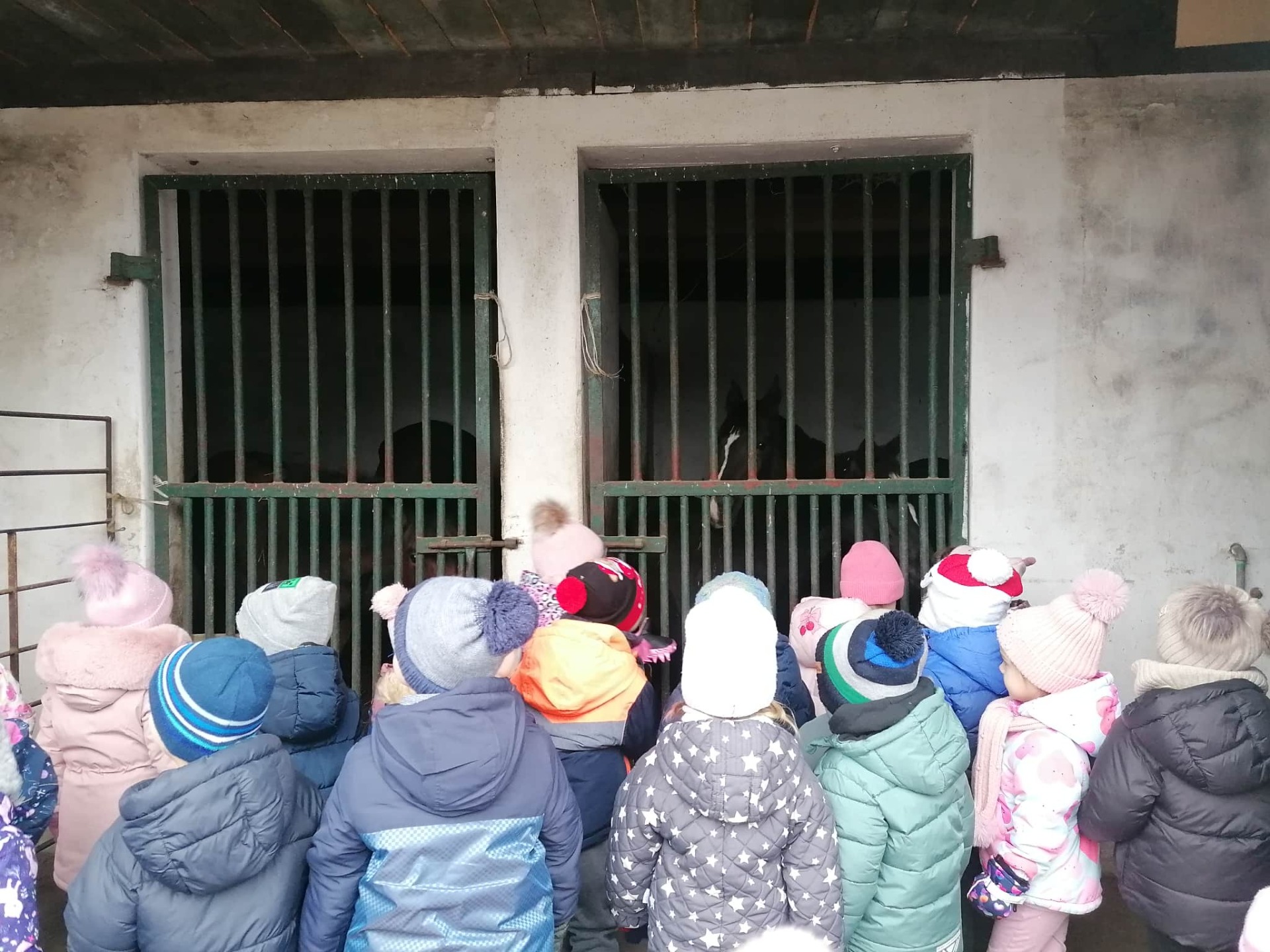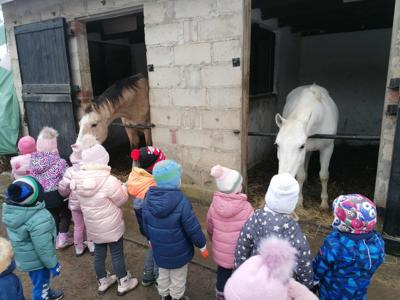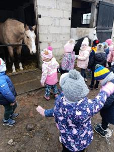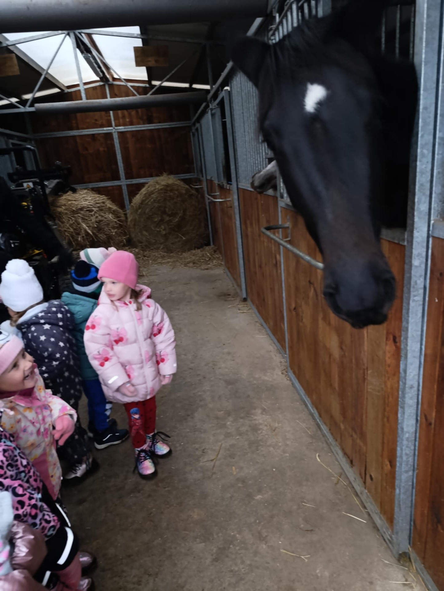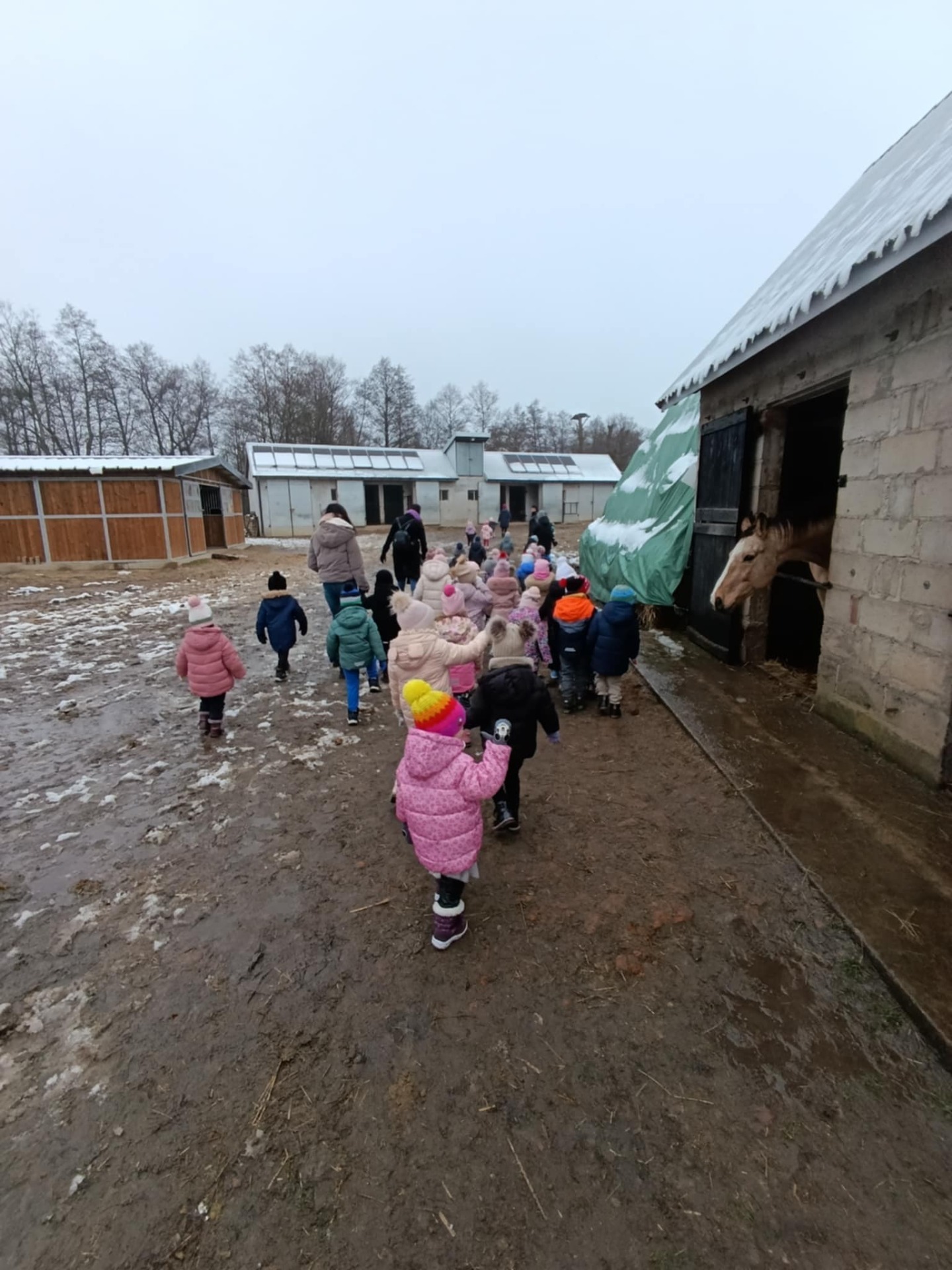 2 grudnia dzieci z grupy I i II wybrały się na wycieczkę do gospodarstwa w Mrodze Górnej. Podczas spaceru dziecio obserwowały zwierzęta , które zamieszkują gospodarstwo . Poznały zwyczaje koni , psów , gęsi . To była pierwsza wycieczka autokarowa naszych najmłodszych przedszkolaków z grupy I , teraz już wiemy że dzieci są gotowe na dłuższe wyjazdowe wycieczki. Zostaliśmy zaproszeni przez p. Inez i Jarosława Syrek na wiosenne zwiedzania , wtedy więcej zwierząt jest na wybiegu . Serdecznie dziękujemy za możliwość zwiedzenia gospodarstwa .