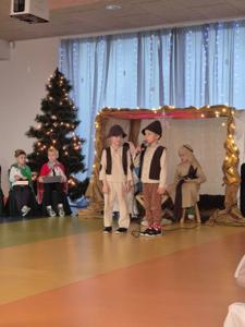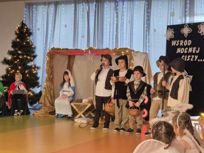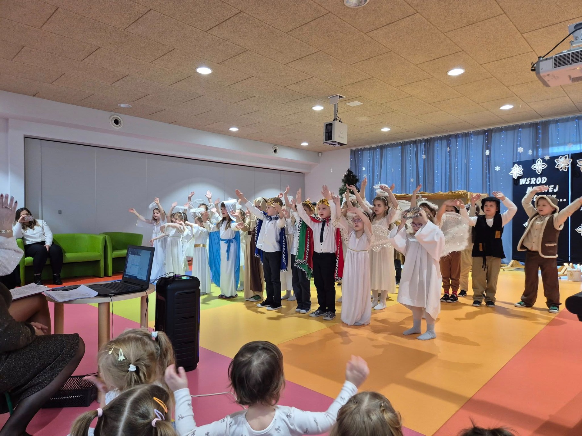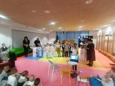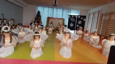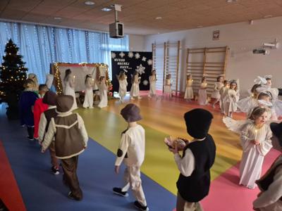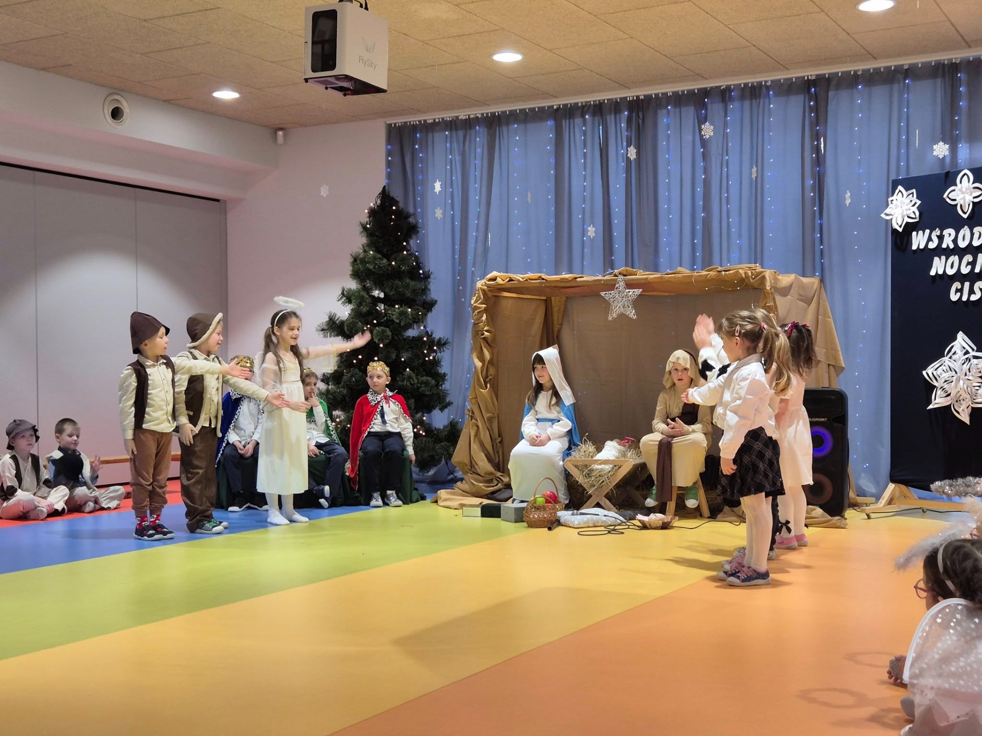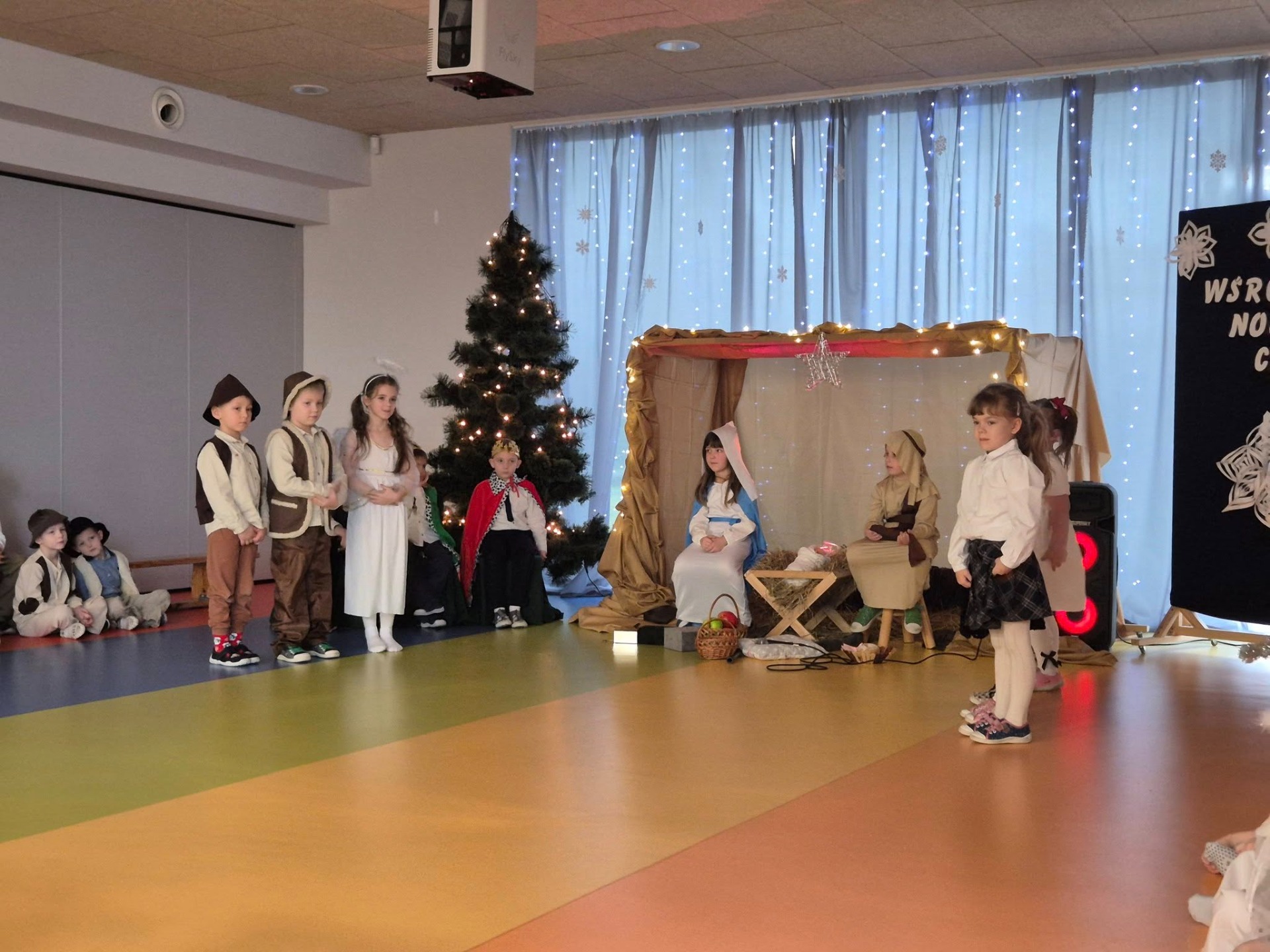 Wigilia Bożego Narodzenia to jeden z najpiekniejszych dni w roku , to czas pełen nadziei , radości i życzliwości dla drugiego człowieka. Dzieci w naszym przedszkolu przygotowywały się do tego dnia od dłuższego czasu ; poznawały tradycje świąteczne , dekorowały sale, wykonywały ozdoby świąteczne i ubierały nimi choinki w salach. W dzień przedszkolnej Wigilii czyli 18 grudnia w całym przedszkolu panowała wyjątkowo podniosła , uroczysta atmosfera . Magiczny czas udzielił się nie tylko dzieciom ale i wszystkim pracownikom przedszkola.W kazdej sali niedługo po śniadaniu przystąpiono do nakrywania stołów wigilijnych , dekorowania ich w zielone gałązki i kolorowe stroiki ., układania dziecięcych smakołyków. Wszyscy odświętnie ubrani czekali na niecodzienne i wyjątkowe wydarzenie . W sali gimnastycznej dzieci z dwóch najstarszych grup IV i V wystawiły jasełka pod tytułem : " Wśród nocnej ciszy".Wierszem i piosenką opowiedziały o cudzie narodzin Jezusa w ubogiej stajence w Betlejem. Mali aktorzy znakomicie odegrli rolę Maryi i Józefa, Aniołów i Pasterzy oznajmiając radosną nowinę oraz Trzech Króli , którzy przybyli złożyć pokłon Jezusowi. Podniosłość w występie dodały śpiewane kolędy i pastorałki. Pięknie wykonany układ taneczny Aniołów ze świecami w scenerii przygaszonych świateł wprowadził wszystkich w jeszcze wyraźniej odczuwalny magiczny czas , w magiczną nocną ciszę. Na koniec jasełka z piosenkami świątecznymi wystąpiły również dzieci uczęszczające na zajęcia z języka angielskiego. Gromkie brawa płynące z widowni były najlepszym podziękowaniem dla małych artystów za ich starania nad przygotowaniami Jasełek. Dopełnieniem występu były piękne życzenia bożonarodzeniowe od małych aktoro , od wychowawczyń najstarszych grup prowadzących występ , od Pani Dyrektor oraz zaproszonego na uroczystość księdza Dawida .