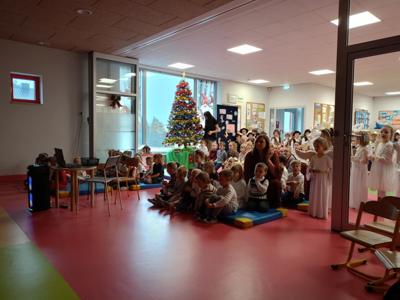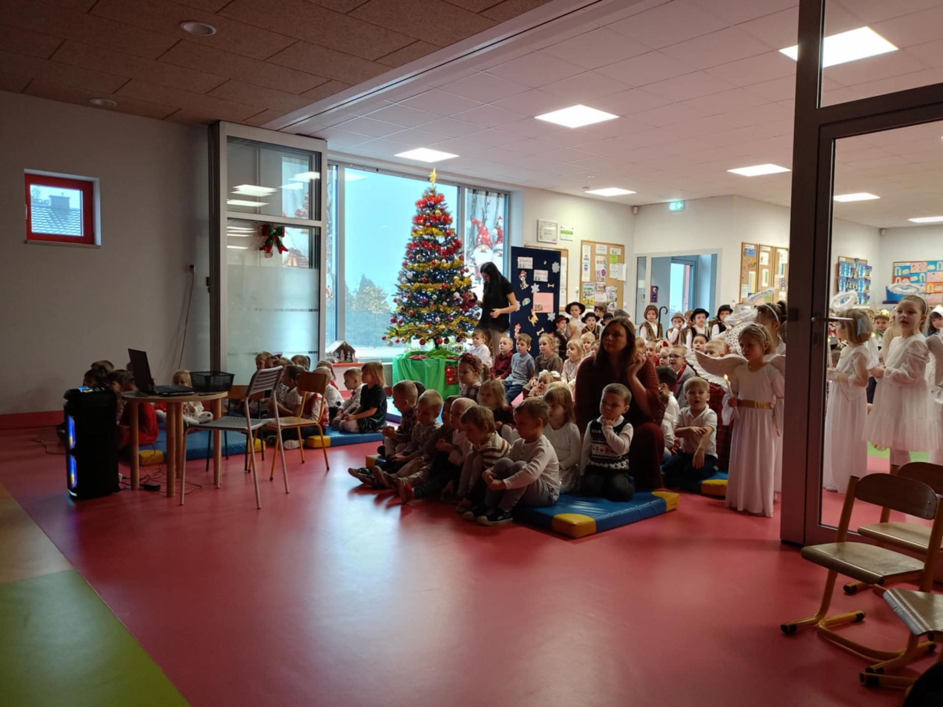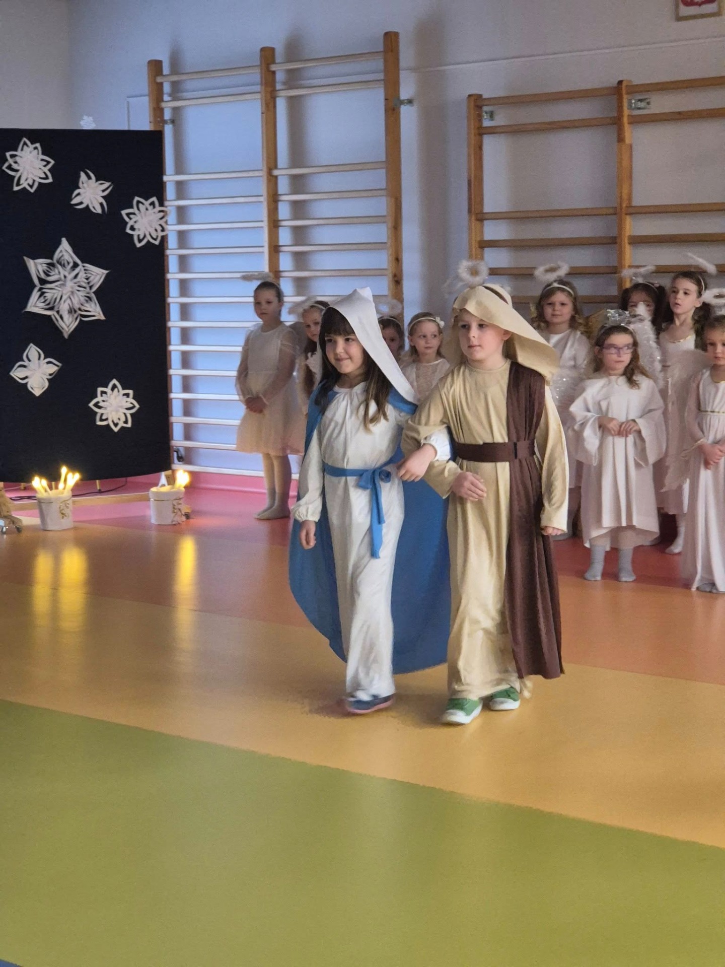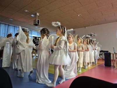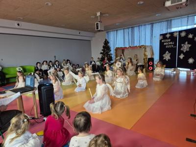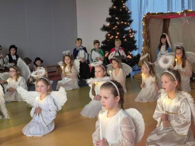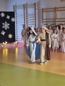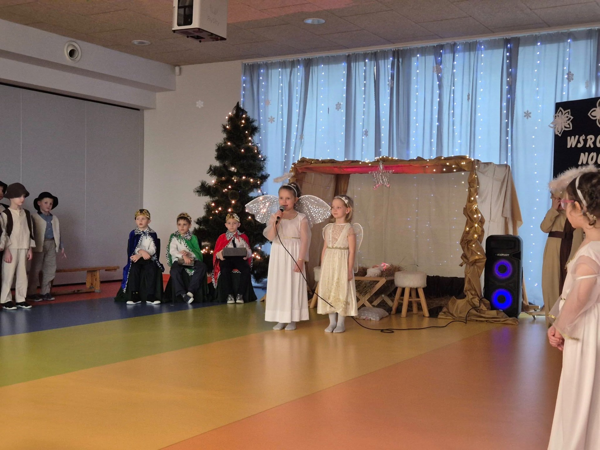 Wigilia Bożego Narodzenia to jeden z najpiekniejszych dni w roku , to czas pełen nadziei , radości i życzliwości dla drugiego człowieka. Dzieci w naszym przedszkolu przygotowywały się do tego dnia od dłuższego czasu ; poznawały tradycje świąteczne , dekorowały sale, wykonywały ozdoby świąteczne i ubierały nimi choinki w salach. W dzień przedszkolnej Wigilii czyli 18 grudnia w całym przedszkolu panowała wyjątkowo podniosła , uroczysta atmosfera . Magiczny czas udzielił się nie tylko dzieciom ale i wszystkim pracownikom przedszkola.W kazdej sali niedługo po śniadaniu przystąpiono do nakrywania stołów wigilijnych , dekorowania ich w zielone gałązki i kolorowe stroiki ., układania dziecięcych smakołyków. Wszyscy odświętnie ubrani czekali na niecodzienne i wyjątkowe wydarzenie . W sali gimnastycznej dzieci z dwóch najstarszych grup IV i V wystawiły jasełka pod tytułem : " Wśród nocnej ciszy".Wierszem i piosenką opowiedziały o cudzie narodzin Jezusa w ubogiej stajence w Betlejem. Mali aktorzy znakomicie odegrli rolę Maryi i Józefa, Aniołów i Pasterzy oznajmiając radosną nowinę oraz Trzech Króli , którzy przybyli złożyć pokłon Jezusowi. Podniosłość w występie dodały śpiewane kolędy i pastorałki. Pięknie wykonany układ taneczny Aniołów ze świecami w scenerii przygaszonych świateł wprowadził wszystkich w jeszcze wyraźniej odczuwalny magiczny czas , w magiczną nocną ciszę. Na koniec jasełka z piosenkami świątecznymi wystąpiły również dzieci uczęszczające na zajęcia z języka angielskiego. Gromkie brawa płynące z widowni były najlepszym podziękowaniem dla małych artystów za ich starania nad przygotowaniami Jasełek. Dopełnieniem występu były piękne życzenia bożonarodzeniowe od małych aktoro , od wychowawczyń najstarszych grup prowadzących występ , od Pani Dyrektor oraz zaproszonego na uroczystość księdza Dawida .
